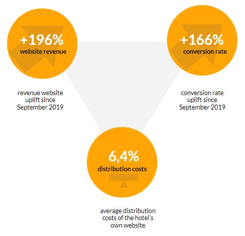 The first positive results can be seen approximately ten months after the start of the cooperation in September 2019. The new hotel website was successfully established as a distribution channel and now generates an outstanding 80% share of total revenues. It is worth noting that sales exclusively via the website have increased by 196% compared to the start of the full management contract.