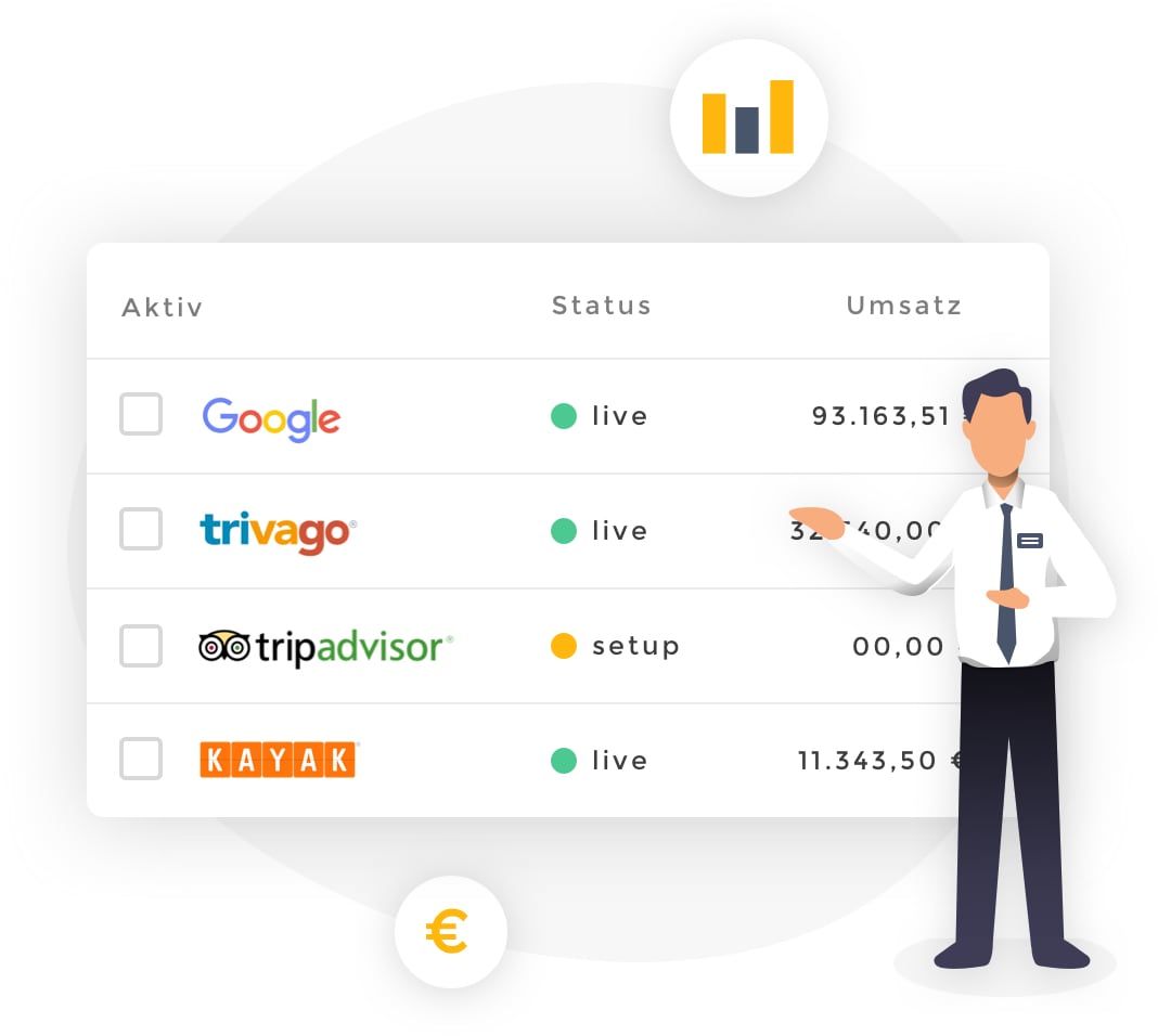 Sie möchten wissen, wie sich Ihre Online-Buchungen, Umsätze und ROI entwickeln und ob sich Ihre Marketingkampagnen auszahlen? Wir liefern Ihnen alle wichtigen Kennzahlen, die Sie brauchen. Nutzen Sie unser exklusives Online-Reporting und sehen Sie Ihre Ergebnisse ganz entspannt in einem Überblick.